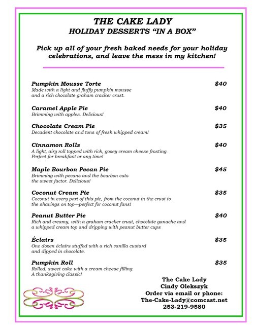 Stressing over desserts for Thanksgiving or Christmas? No worries, The Cake Lady can take care of you! I make a variety of delicious holiday desserts that are sure to impress your guests! Space/orders are limited so contact me today!